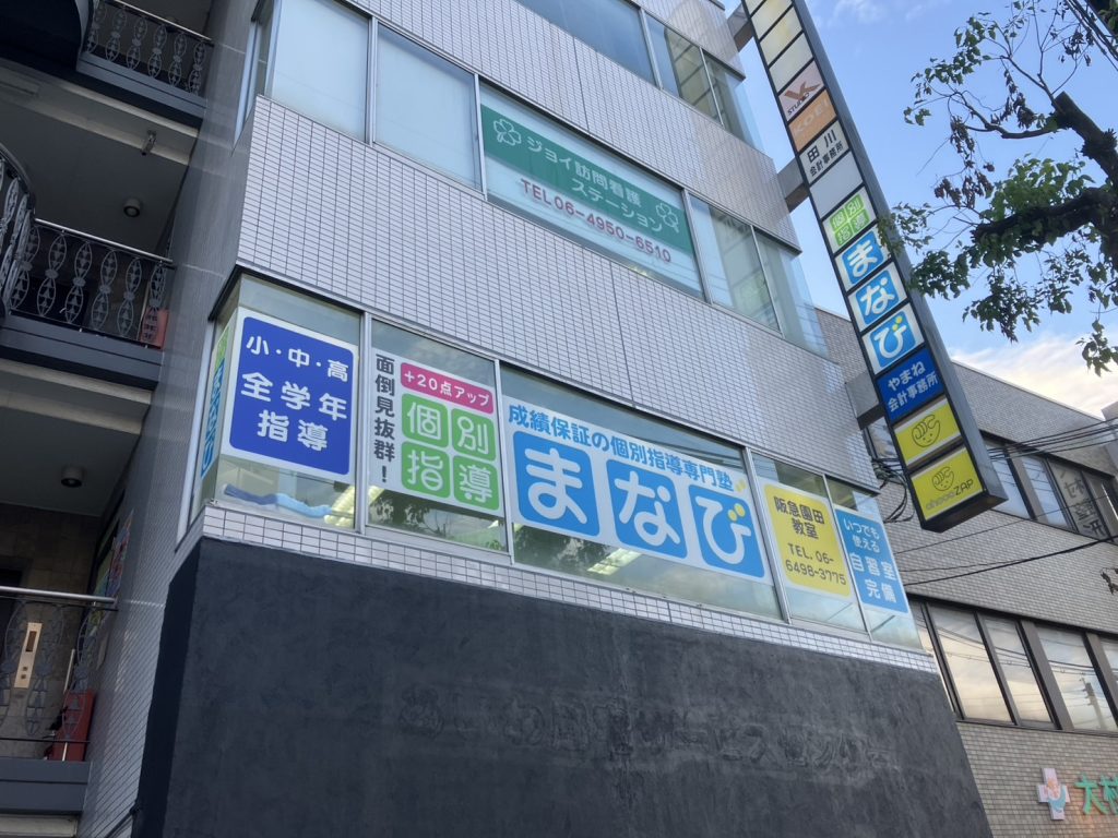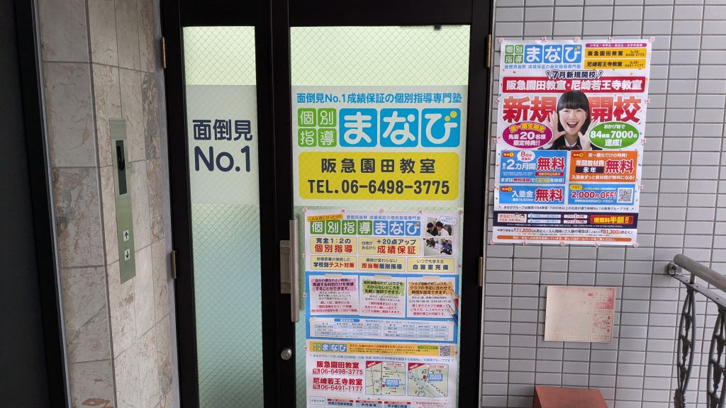阪急園田駅から北西へ徒歩3分。園和小学校向かい園田橋線沿い、交差点カドのドミノピザとチョコザップの建物の2階です。