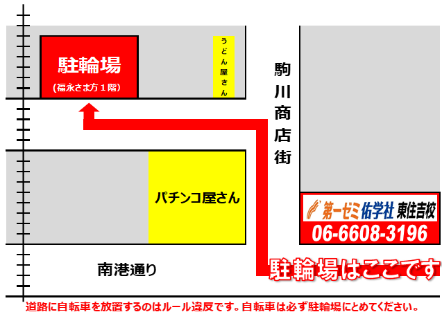 大阪メトロ駒川中野より 1番出口の改札から正面の地下通路を通って西へ。地上「駒川中野駅前」交差点の信号を渡り正面のファミリーマートさんのビル4階。エレベーター入口はファミリーマートさんの右手(西側)
