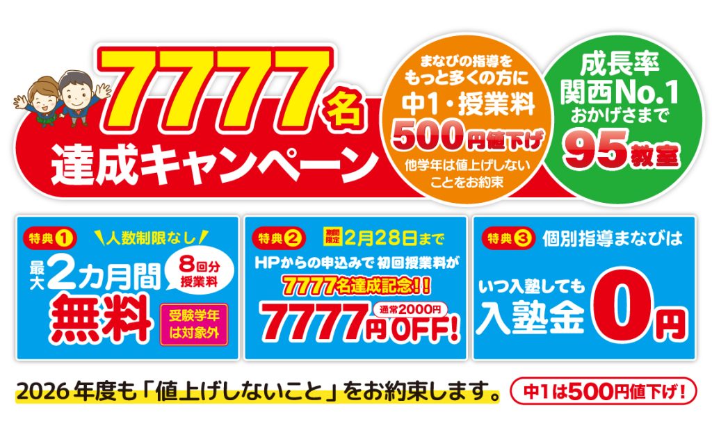 89教室・約8000名の子供たちが通う「成長率関西No,1」の「個別指導まなび」だからできる企業努力により、授業料・教材費等の子供たちの指導にかかるすべての費用を2026年度も値上げしない(※)ことをお約束します。